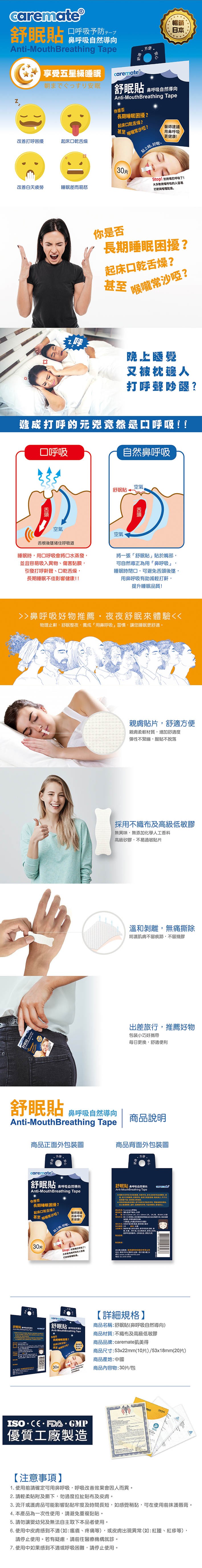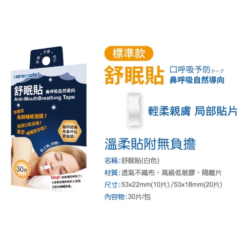 本產品貼於嘴部,可自然導正為用鼻呼吸,避免舌頭後墜,有助減輕打鼾,提升睡眠品質。